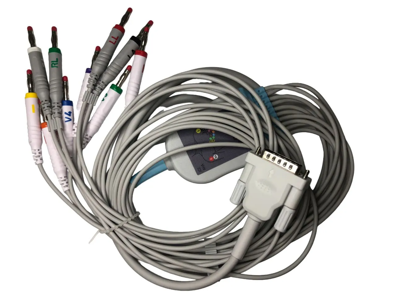 Cabo Eletrocardiógrafo 10 vias IEC Banana, compatível com TEB, indicado para utilização em monitorização cardíaca, possui caixa intermediária blindada e identificação de posicionamento de derivações.